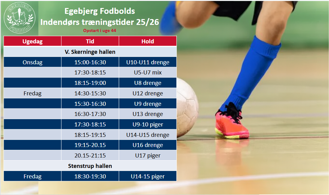 Indendørs træningstider for børne-/ungdomsafdelingen